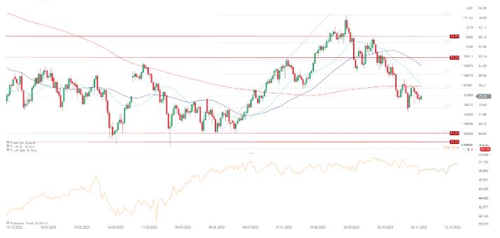 El WTI (OIL.WTI) volvió a subir por encima de los 75 dólares por barril. Es un nivel clave al que los alcistas deben prestar atención esta semana. Al mismo tiempo, parece que la media móvil de 200 períodos y el retroceso del 61,8% pueden estar actuando como techo para los precios del petróleo en las próximas semanas. Los patrones estacionales sugieren un comportamiento plano de los precios del petróleo en las próximas dos semanas. Fuente: xStation5