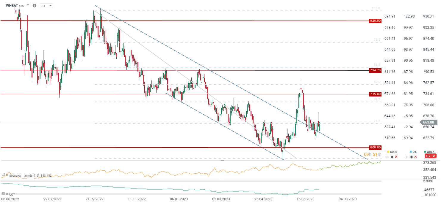 Los especuladores siguen cerrando posiciones cortas. La falta de exportaciones de trigo ucraniano por mar podría conducir nuevamente a una mayor demanda de trigo estadounidense o sudamericano. Fuente: Bloomberg, XTB