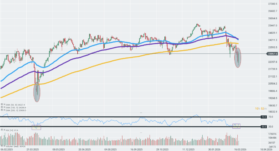 En este momento, sin embargo, los índices europeos están subiendo con fuerza. El DAX 40 alemán sube actualmente un 3%, mientras que los futuros del Nikkei 225 en Asia ganan hasta un 5%. Pese al rebote, el DAX 40 sigue por debajo de la EMA de 200 días, lo que significa que la confirmación del cambio a una tendencia bajista a largo plazo continúa.
