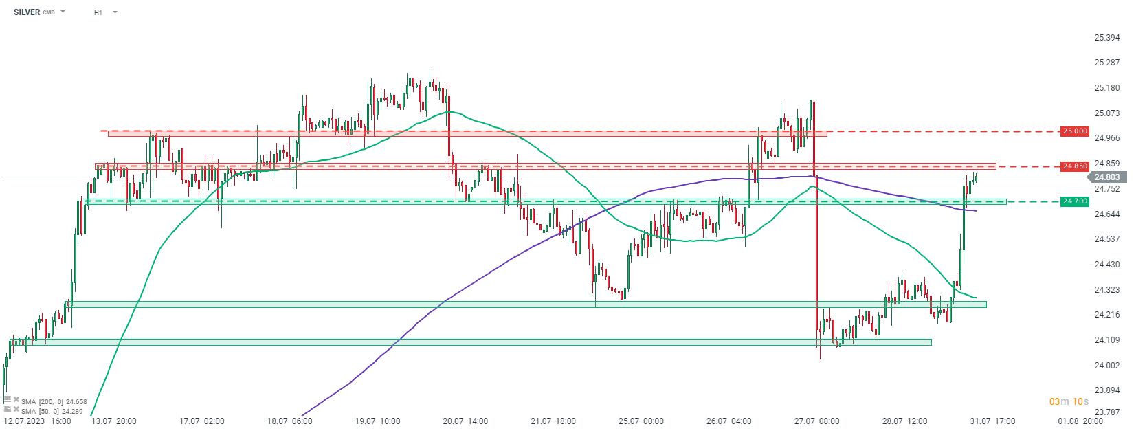 El dólar más débil, así como el movimiento moderado del Banco de Japón, están impulsando los metales preciosos hoy. La PLATA cotiza un 2% más alto y se acerca a la zona de resistencia a corto plazo de $24.85. Fuente: xStation5.