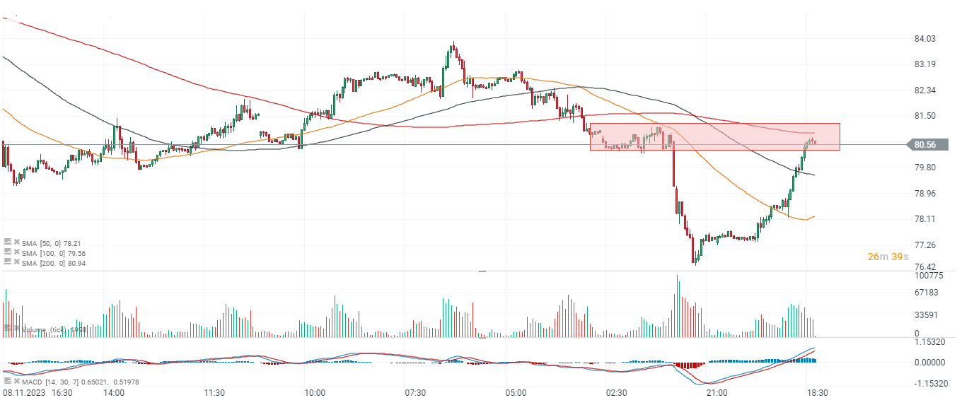 El Petroleo se está acercando a los niveles de precios previos a la gran liquidación de ayer, y ahora a 80 dólares por barril, una fuerte oferta podría potencialmente reiniciarse. Por otro lado, una nueva ruptura por encima de los 81 dólares podría crear un panorama técnico ligeramente más alcista para el petroleo. Fuente: xStation5