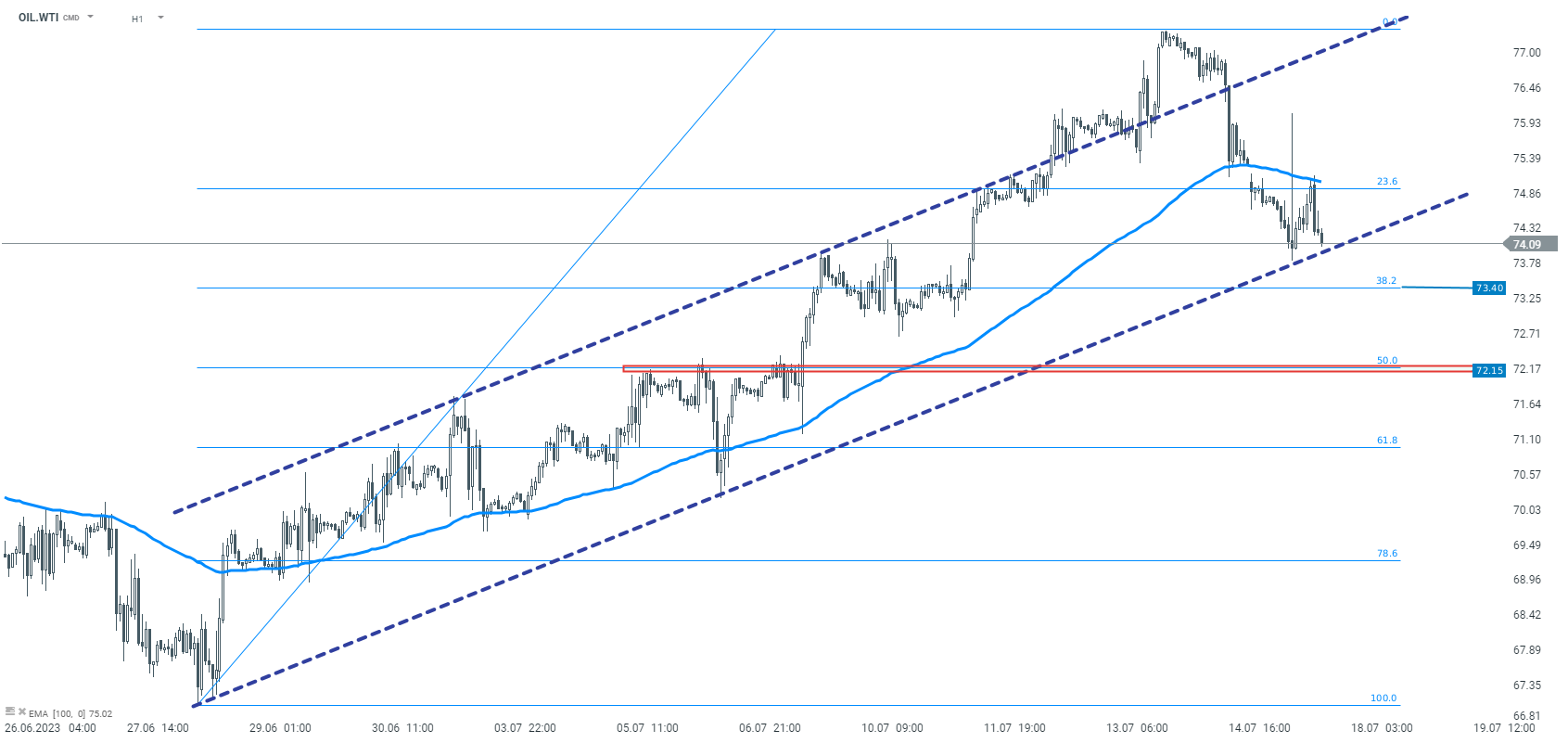 Las cotizaciones de OIL.WTI están probando el límite inferior del canal alcista. Si se rompe el soporte, podrían producirse caídas hacia las medidas de retroceso del 38.2% o 50% de Fibonacci. Fuente: xStation5.