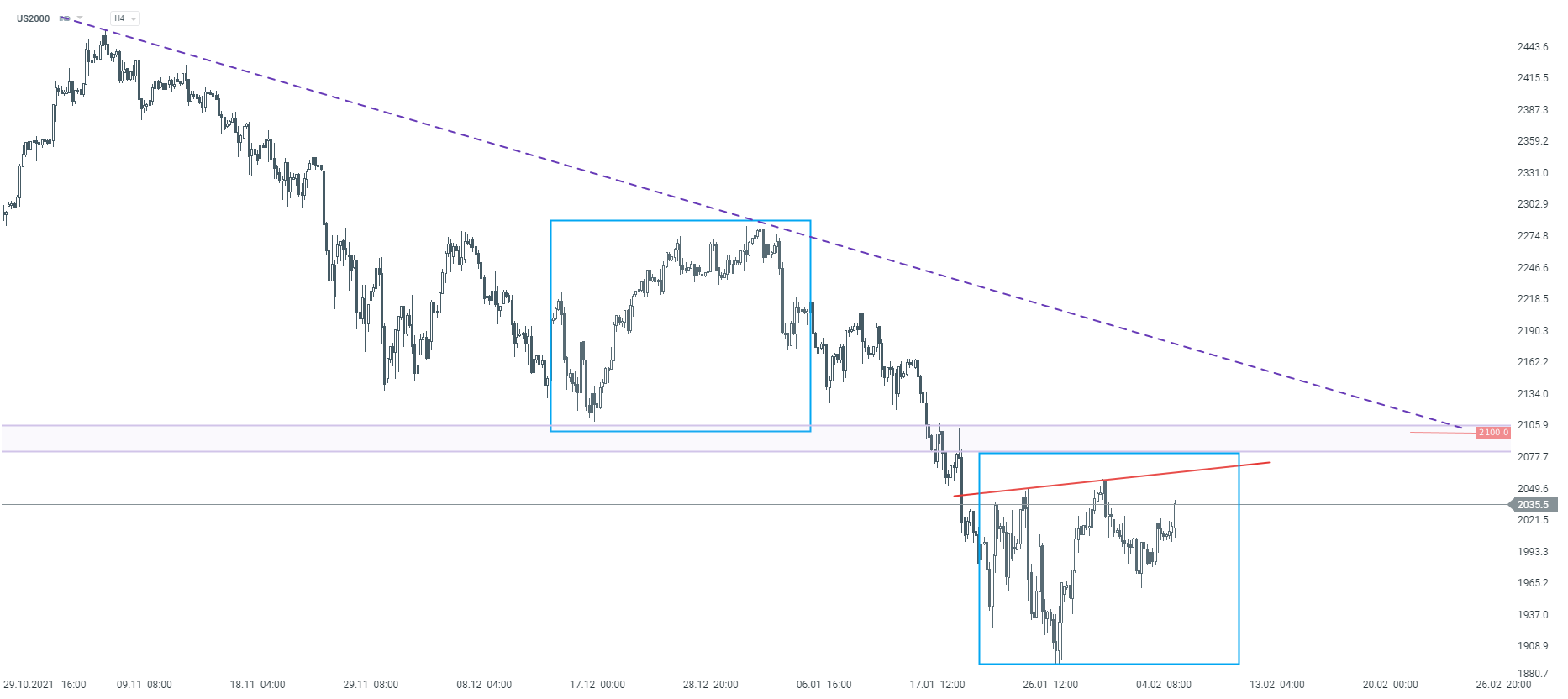 Echando un vistazo al gráfico de US2000 en el intervalo H4, podemos ver que se está formando un posible patrón inverso de cabeza hombros. Tal patrón técnico a menudo anuncia un cambio de tendencia. Sin embargo, cabe señalar que una importante zona de resistencia, marcada con la geometría del mercado y el límite inferior de un rango de negociación de un año, se puede encontrar por encima del escote del patrón. Por lo tanto, una ruptura por encima de 2,100 pts podría verse como una señal alcista. Fuente: xStation5