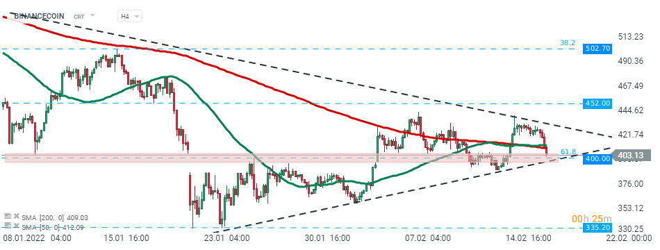 Binance Coin, que es un token nativo de Binance, el intercambio de criptomonedas más grande del mundo, cayó bruscamente luego de la noticia de que la compañía detuvo sus actividades comerciales en Israel mientras la autoridad de mercados de capital del país examina las licencias del intercambio. Actualmente, el precio se acerca al soporte psicológico en $ 400,00, que está marcado con un retroceso de Fibonacci del 61,8 % de la onda ascendente lanzada en junio de 2021 y el límite inferior de la formación del triángulo. Fuente: xStation5