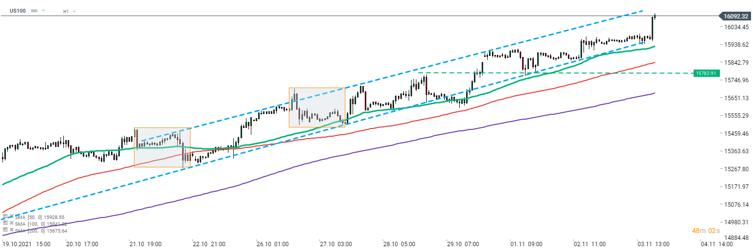 Nasdaq-100 (US100) se recuperó durante la conferencia de prensa de Powell y superó la marca de los 16.000 pts por primera vez en la historia. Los mercados acogieron con satisfacción un ritmo moderado de tapering y una orientación bastante moderada sobre los tipos. Fuente: xStation5