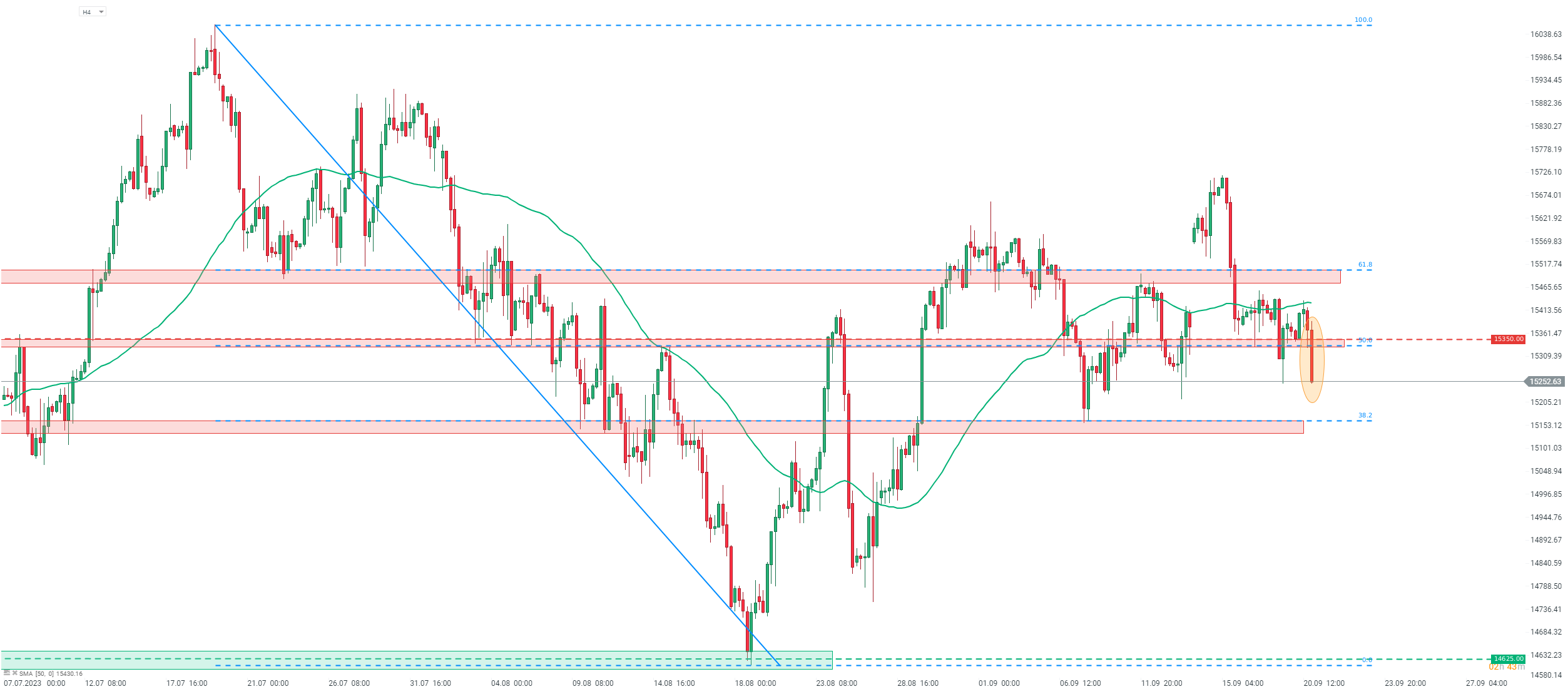 La orientación restrictiva de las proyecciones de la Fed ha desencadenado una venta de activos de mayor riesgo como las acciones, especialmente las de tecnología. Los futuros del Nasdaq-100 bajan un 0.9% en el día y están probando los mínimos diarios. Fuente: xStation5.