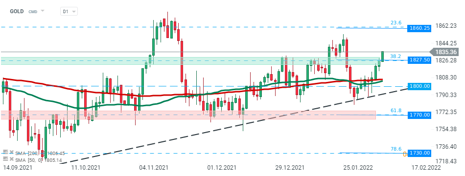 El precio del oro logró superar la resistencia principal de 1827,50$ durante la sesión de hoy, lo que coincide con un retroceso de Fibonacci del 38,2 % de la ola alcista lanzada en marzo de 2021. Si prevalece el sentimiento actual, el movimiento alcista puede acelerarse hacia la resistencia de 1860,25 $ marcada con un retroceso del 23,6 %. Fuente: xStation5
