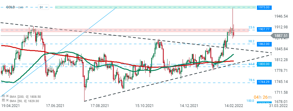 El oro retrocedió por debajo del nivel de 1900 dólares debido a que las crecientes tensiones geopolíticas reducen las probabilidades de que la FED introduzca una subida de tipos de 50 pb en marzo. Si prevalece el sentimiento actual, el movimiento a la baja puede acelerarse hacia el soporte en $1862,00, que está marcado con un retroceso de Fibonacci del 38,2 % de la última ola alcista. Fuente: xStation5