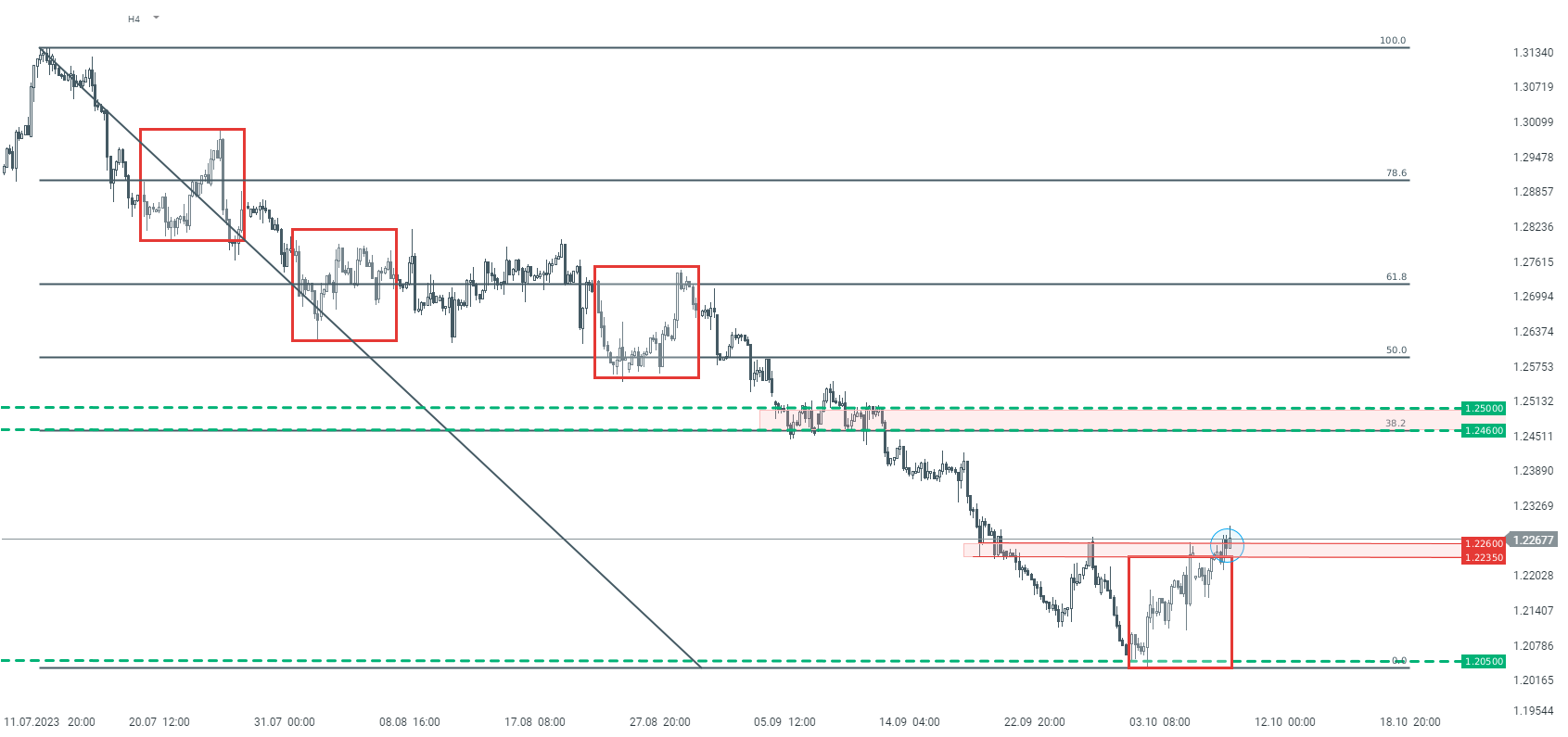 La GBP/USD rompió por encima de la zona de resistencia de 1.2235-1.2260, marcada con el límite superior de la geometría del mercado local así como las reacciones de precio anteriores. Si los toros se mantienen en control, el movimiento ascendente podría extenderse hacia la resistencia de 1.2460-1.2500. Fuente: xStation5.