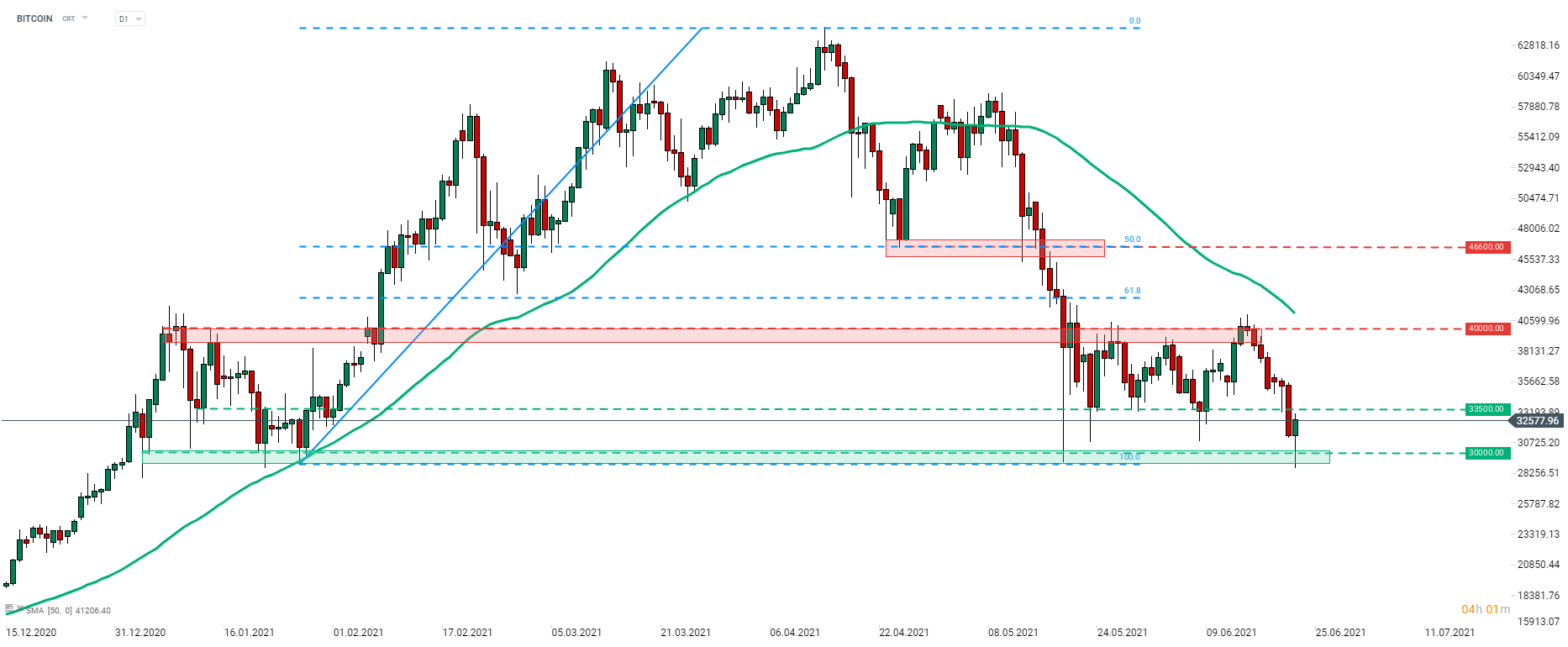 BITCOIN testeó el área de $ 29,000 y se negoció al nivel más bajo desde fines de enero de 2021. Sin embargo, la criptomoneda comenzó a recuperar terreno más tarde y ahora cotiza positivamente en el día en el área de $ 32,500. Fuente: xStation5