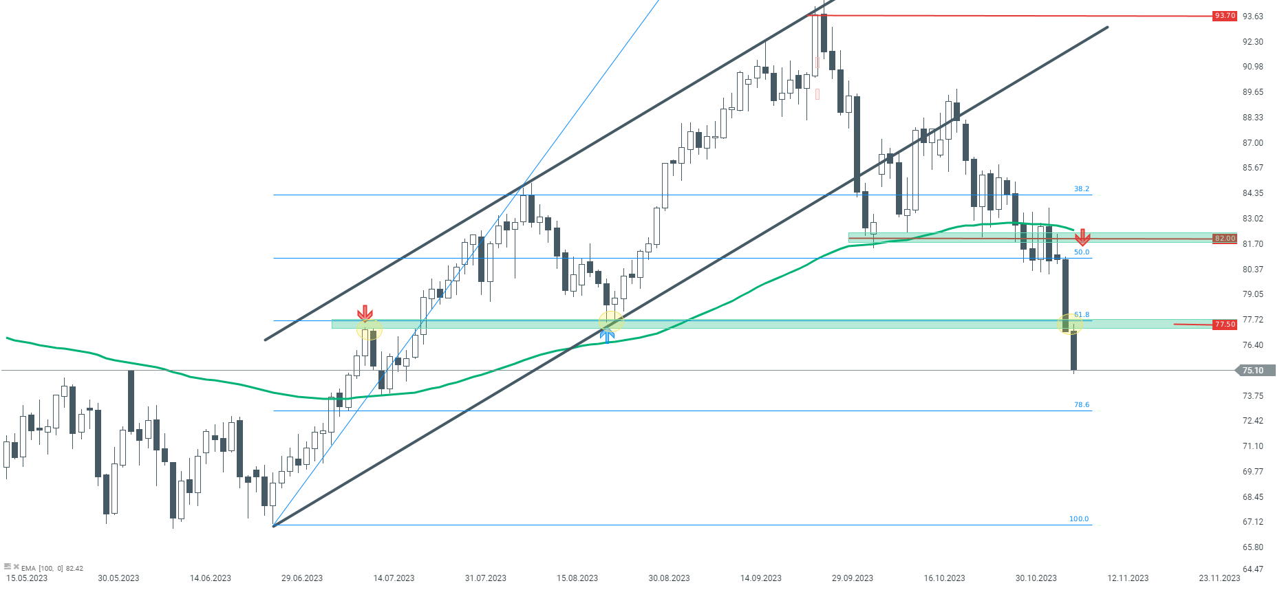 El miércoles es otro día marcado por la debilidad del petróleo. El WTI rompió por debajo de la zona de soporte de 77,50 dólares, allanando el camino para una caída aún más profunda. Fuente: xStation5