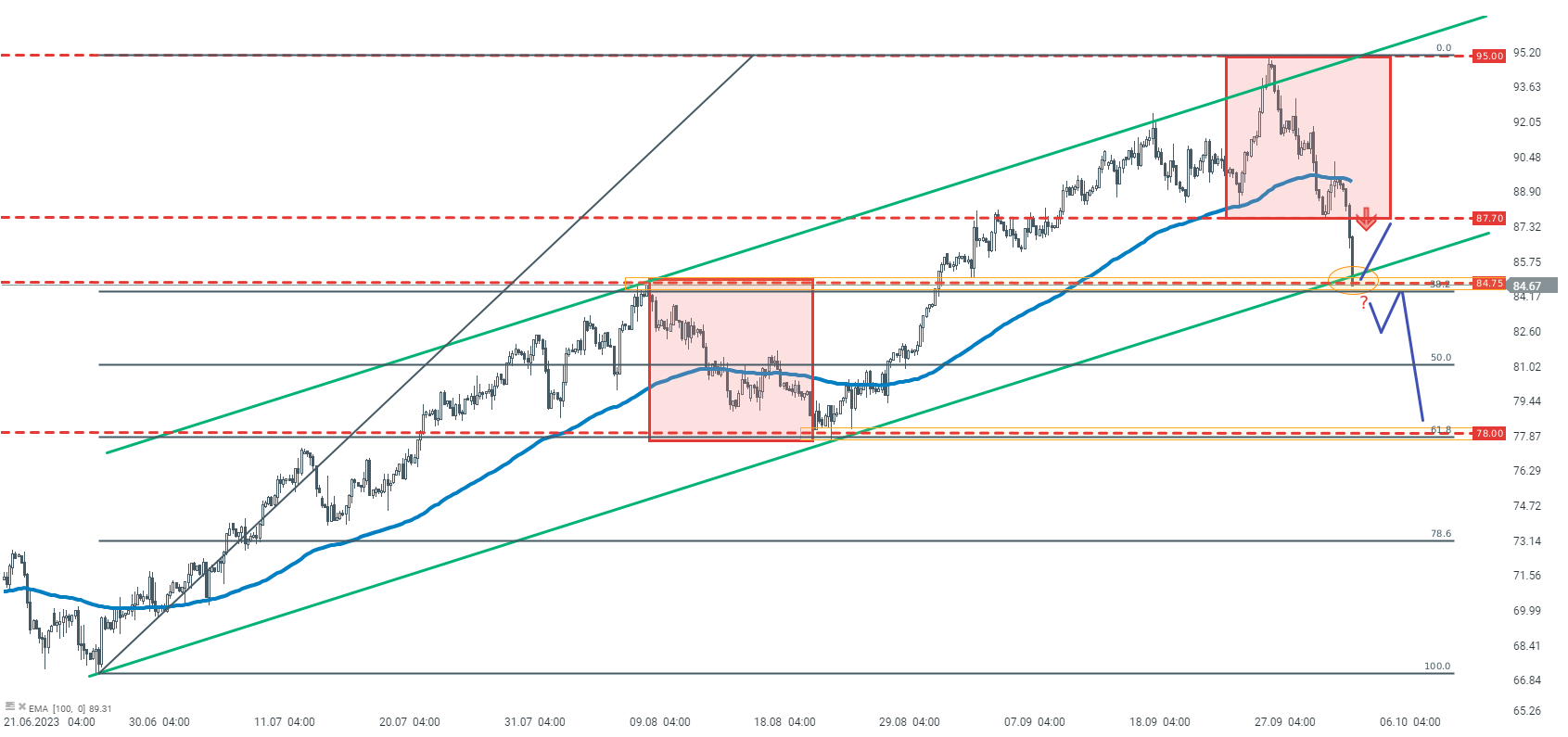 Las cotizaciones del petróleo se desplomaron después de romper por debajo del límite inferior de la relación 1:1. Actualmente, se está probando una zona de soporte clave en el nivel de 84.75$. Si se rompe, la tendencia podría volverse bajista.