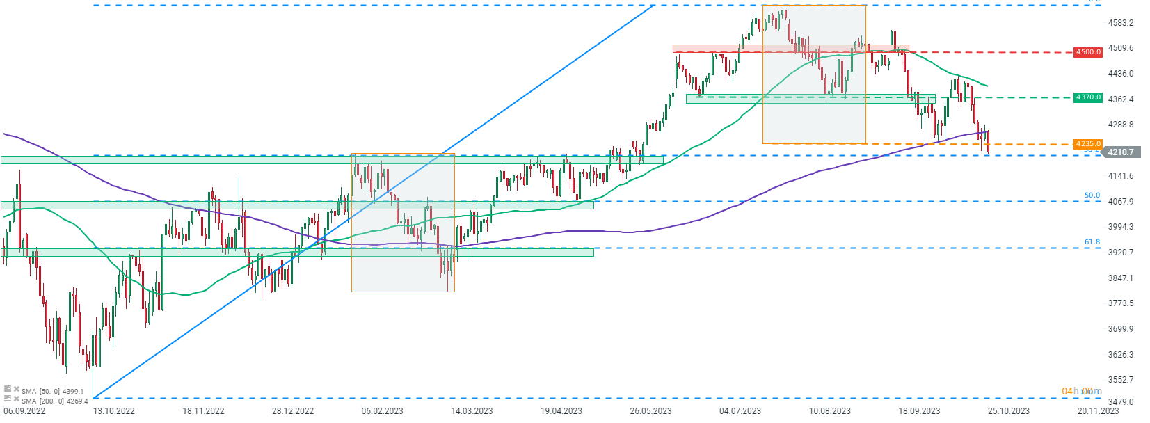 El S&P 500 rompió hoy por debajo del límite inferior de la estructura de sobrebalance, insinuando una inversión de la tendencia bajista. El índice cayó a niveles no vistos desde el cambio de mayo y junio de 2023. Fuente: xStation5.