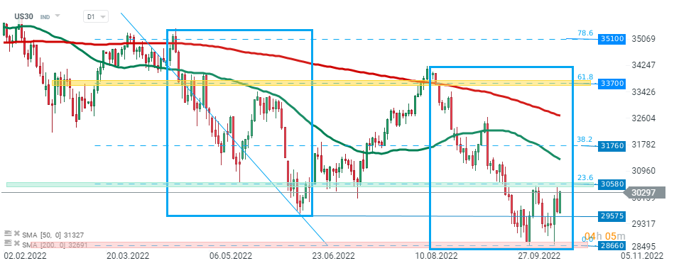 El US30 subió hoy ya que algunos analistas creen que hay razones técnicas para que el mercado experimente un alivio a corto plazo. El índice se acerca actualmente a la resistencia local en 30580 pts, que está marcada con un retroceso de Fibonacci del 23,6 % de la última ola bajista. En caso de una ruptura alcista, el movimiento alcista puede acelerarse hacia la próxima resistencia en 31760 pts. Fuente: xStation5