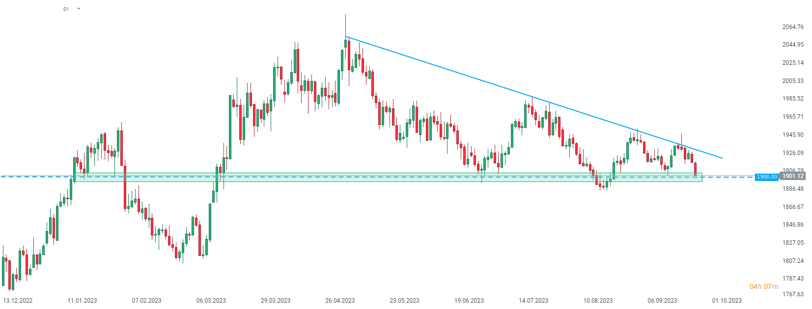 El oro continúa retrocediendo ante el aumento de los rendimientos de los bonos y está probando la zona de soporte de $1,900. Fuente: xStation5