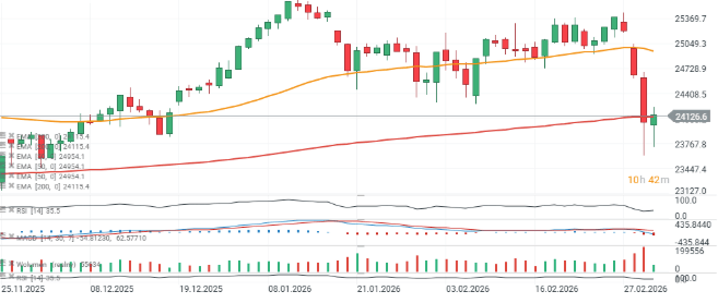 El contrato de futuros del DAX alemán intenta mantener el impulso alcista, aunque el ritmo de las subidas se ha ralentizado ligeramente. No obstante, las largas mechas inferiores de las últimas tres velas sugieren un interés comprador persistente, con el contrato rebotando nuevamente desde el soporte en la EMA200 (línea roja).