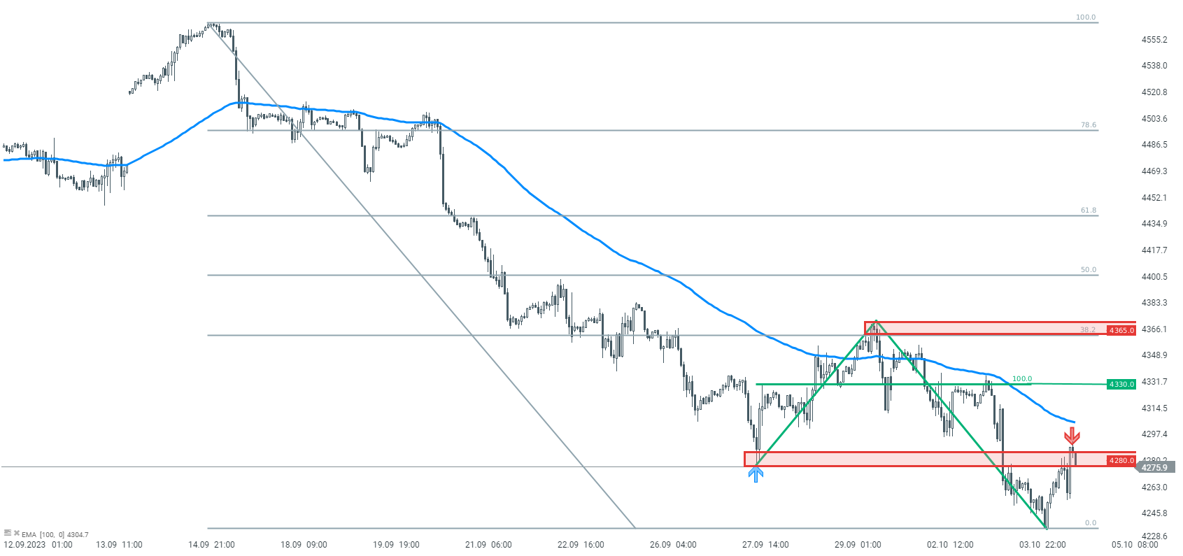 Al observar un marco de tiempo más corto - H1, el índice permanece en una tendencia a la baja. La resistencia a corto plazo clave es actualmente la zona probada alrededor de los 4280 puntos. Si se superara, el siguiente nivel significativo sería 4330 puntos, que corresponde a la corrección alcista anterior. Si eso también se superara, la siguiente resistencia cae alrededor de 4365 puntos, resultado de picos locales anteriores y midiendo el 38.2% de la última ola a la baja. Parece que solo su negación podría llevar a un cambio en el sentimiento a alcista.
