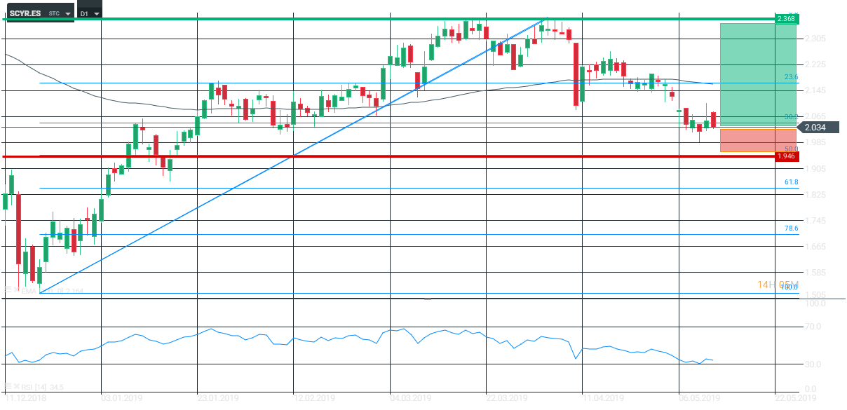 Un punto a tener en cuenta es que la cartera de ingresos de SACYR en mayor medida procede del exterior y la incertidumbre comercial puede llevar a la entidad a perder niveles de soporte. Teniendo esto en consideración podríamos colocar un stop-loss en el nivel 50 de Fibonacci cercano a los 1,95 euros pensando minimizar el riesgo en nuestra estrategia, el valor podría seguir corrigiendo e incluso seguir perdiendo cotas agravando el movimiento bajista.
