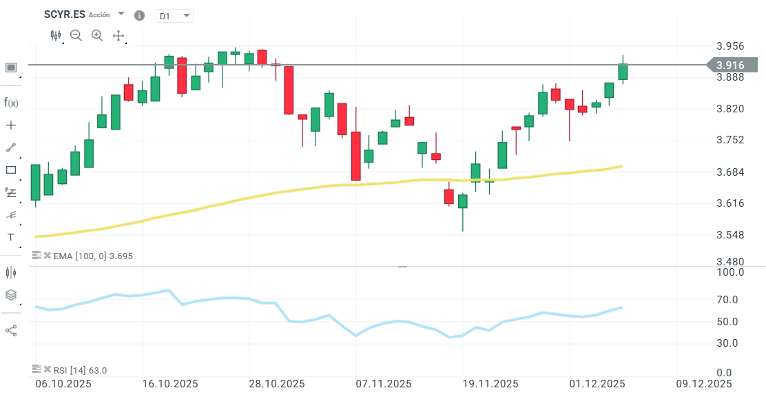 Las acciones de Sacyr suben un 1% intradía mientras que en el acumulado del 2025 el ascenso alcanza el 21,5%. La mejora bursátil de la constructora se fundamenta en sus nuevas concesiones y en la mejora de la generación de caja. El RSI de 14 periodos para Sacyr finaliza en los 63 puntos mientras que la EMA de 100 sesiones se sitúa un 6% por debajo de la cotización actual. Sacyr tiene encaje en una cartera bursátil con perfil defensivo debido a su mayoritario negocio concesional.