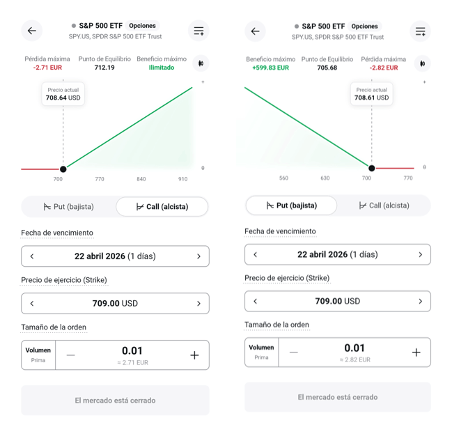 Por ejemplo, si piensas que se llegará a un acuerdo de última hora y que esto provocará subidas del S&P 500, puedes comprar opciones call con el ticker SPY.US Opción. Por el contrario, si crees que finalmente no se llegará a un acuerdo y que el S&P 500 va a caer, puedes comprar una put. Para operar puedes hacerlo a partir de las 15:30 hora española, que es cuando abre el mercado americano.
