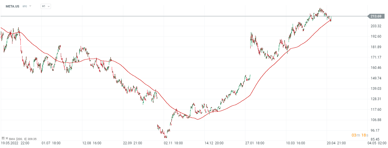 Meta Platforms (META.US), intervalo H1 Las acciones de la compañía subieron más del 70 % este año, frente a un aumento del 8 % en el S&P500, y se recuperaron un 140 % desde su mínimo de noviembre. El precio mantuvo una tendencia alcista antes de los resultados y mantuvo el soporte en el SMA200 en el intervalo horario. Fuente: xStation5