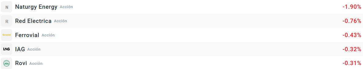 La parte bajista del Ibex35 está copada por Naturgy, aunque se debe a que está descontando del dividendo que pagará el miércoles. Redeia y Ferrovial también se anotan caídas e IAG, que reportará sus resultados este viernes, también ha comenzado mal la semana.