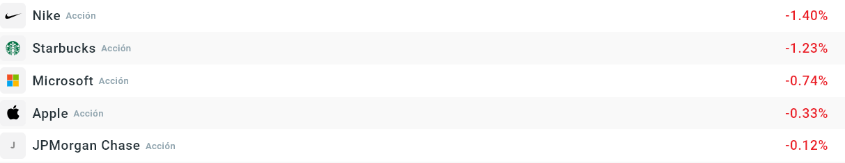 Por la parte baja vemos a Nike y Starbucks, que se toman una pausa después de las importantes subidas de las últimas semanas. Recordemos que ambas empresas acaban de cambiar de CEO, por lo que el mercado está poniendo ya el foco en los próximos resultados pero sobre todo en el próximo año.