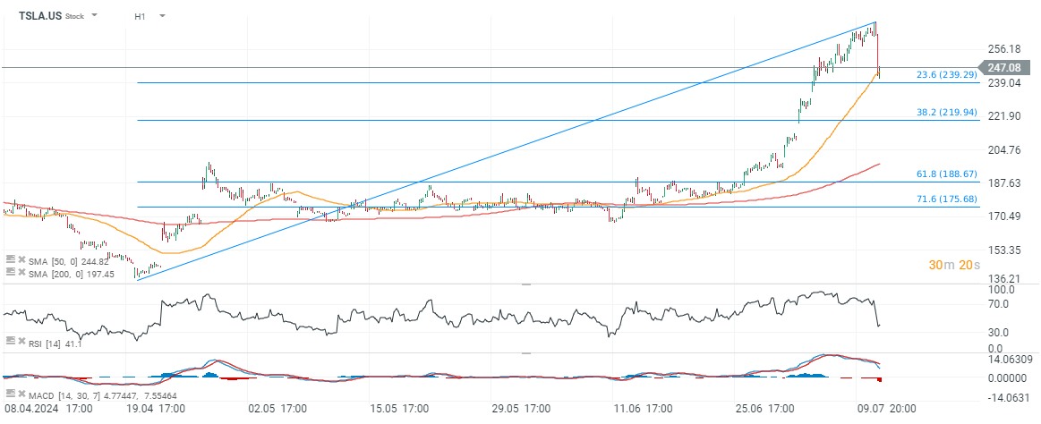 Las acciones de Tesla (TSLA.US) caen hoy en medio de la toma de beneficios del mercado de valores estadounidense después del informe del IPC y una mayor presión de venta entre las acciones tecnológicas estadounidenses. También es el componente 'Mag7' más débil en la actualidad, con acciones cayendo hasta un 6,5% después de que Bloomberg informara que Tesla retrasará la tan esperada presentación de Robotaxi, citando fuentes anónimas familiarizadas con el asunto. Según esos 'rumores', Elon Musk planea construir prototipos adicionales, lo que permitirá a los equipos trabajar en ellos durante más tiempo. Fuentes anónimas dijeron que Tesla programará el evento para octubre. El optimismo en torno al evento programado para el 11 de agosto impulsó el rally de 11 días de Tesla, por lo que la información sobre un posible retraso en este evento generó una toma de ganancias. Tesla aún no ha comentado esta noticia.