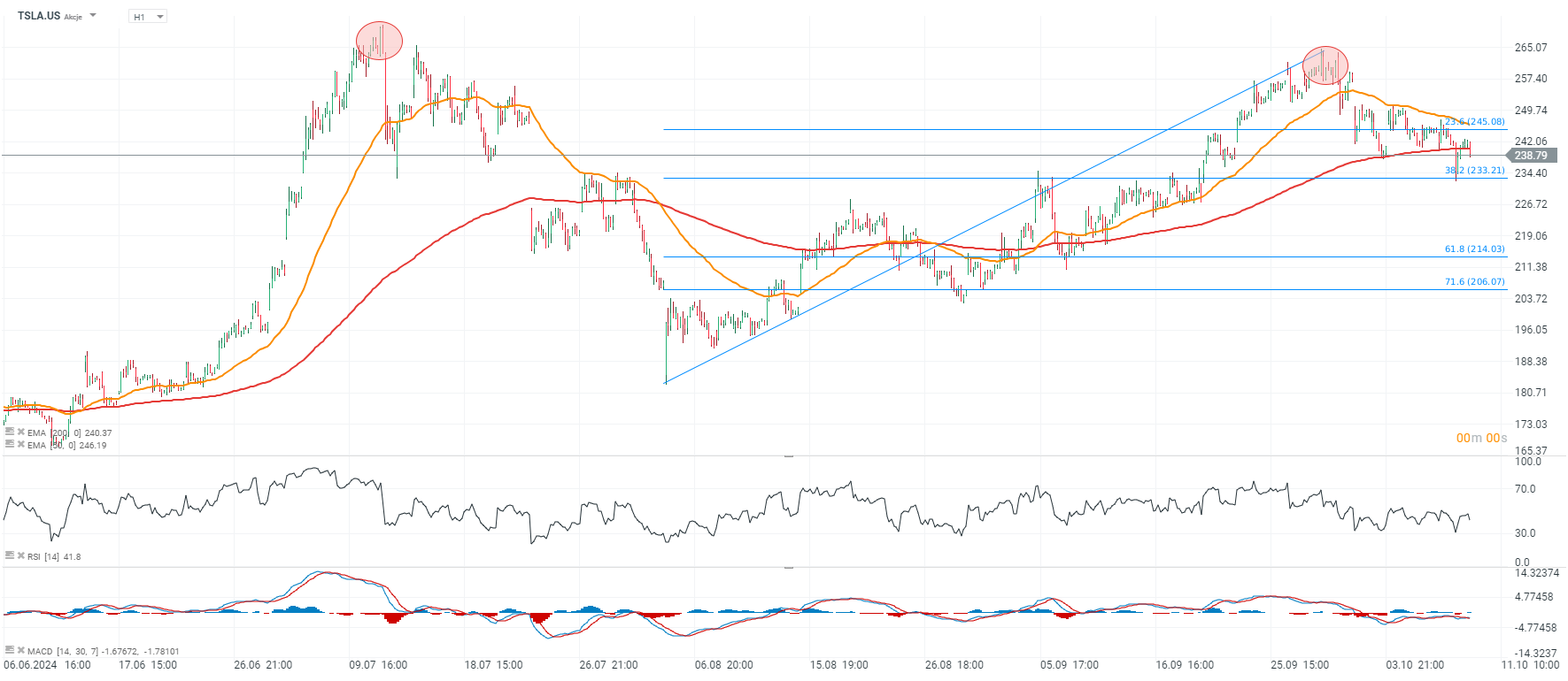 Como podemos ver en el gráfico, la formación de doble techo genera presión sobre las acciones de Tesla, con potencial para probar los 220$ (EMA200, la línea roja).