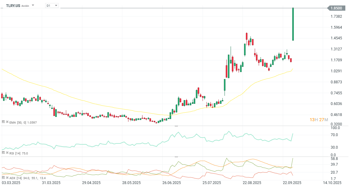 Las acciones de Tilray Brands, empresa de cannabis medicinal, cerraron con una subida de casi el 61 %, alcanzando sus máximos en 13 meses y una capitalización de mercado de más de 2000 millones de dólares.