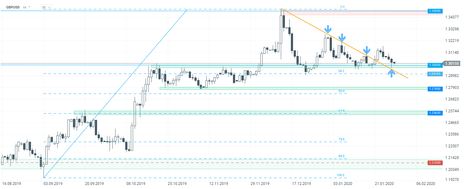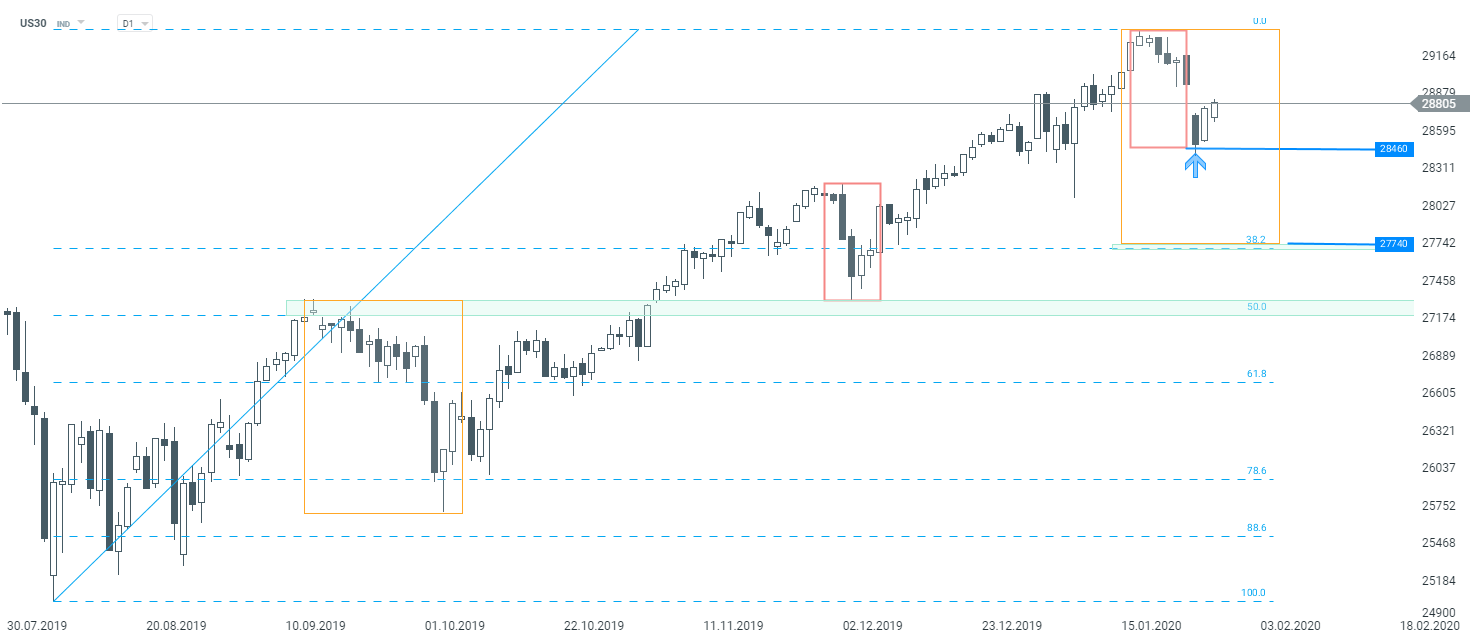 Comencemos el análisis de hoy con el índice bursátil estadounidense: Dow Jones (US30). El índice arrancó la semana con un gap bajista por la preocupación de la propagación del virus chino. Los alcistas lograron detener las caídas en el límite inferior de la estructura local 1:1 en los 28460 pts. Ayer se dibujó un patrón envolvente alcista que sugiere que el movimiento ascendente puede estar llegando. La ruptura potencial por debajo de los 28460 puntos antes mencionados puede considerarse una señal de venta. En tal escenario, el próximo soporte se puede encontrar en 27740 pts. Este lugar está marcado con el límite inferior de la estructura Overbalance y el retroceso de Fibonacci del 38.2% del movimiento ascendente comenzó en agosto de 2019.
