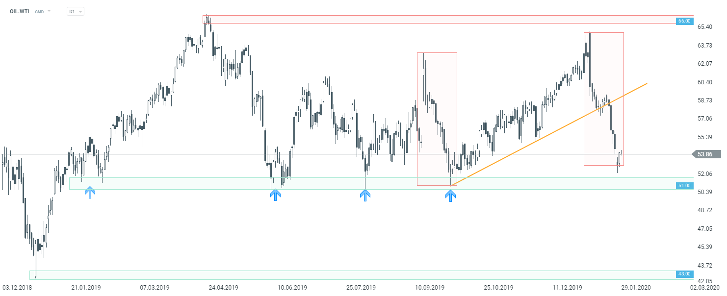 Por último, pero no menos importante, pasemos al mercado del petróleo. Su precio cayó casi un 20% desde su máximo a principios de enero. Sin embargo, al observar el marco de tiempo diario, las disminuciones recientes se detuvieron en el límite inferior de la estructura de Overbalance. Según la metodología, este podría ser un buen lugar para comenzar la recuperación. Sin embargo, si los bajistas mantienen el control, los operadores deben centrarse en el soporte clave en $ 51.