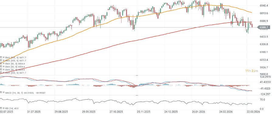 El sentimiento del mercado se ha debilitado con claridad hoy, en un contexto en el que los inversores descuentan un mayor riesgo de escalada en Oriente Medio. Según trascendió, Estados Unidos estaría valorando un “golpe final” contra Irán, una operación terrestre acompañada de bombardeos masivos, lo que ha incrementado la aversión al riesgo en los mercados globales.