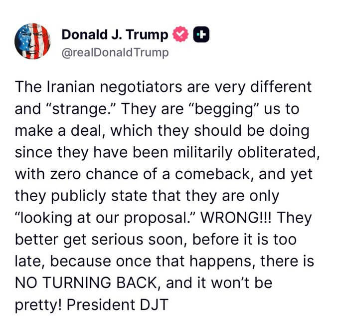 "Los negociadores iraníes son muy diferentes y 'extraños'. Están 'suplicando' que hagamos un acuerdo, lo cual deberían hacer ya que han sido militarmente aniquilados, sin ninguna posibilidad de recuperación, y aun así afirman públicamente que solo están 'mirando nuestra propuesta'. ¡INCORRECTO! Más les vale ponerse serios pronto, antes de que sea demasiado tarde, porque una vez que eso ocurra, NO HABRÁ MARCHA ATRÁS, ¡y no será bonito! Presidente DJT"