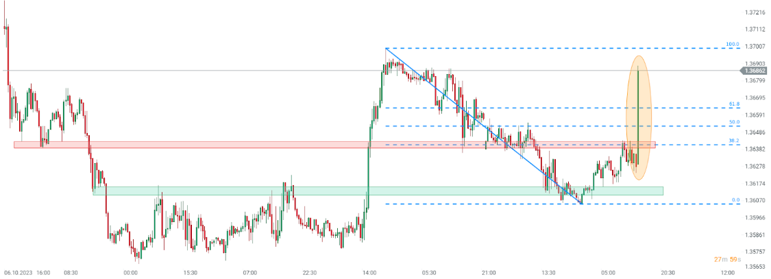 Si observamos el par USD/CAD en un intervalo de 30 minutos, podemos ver que el par se disparó después de la publicación de los datos. Sin embargo, aparte del informe de inflación negativo para el CAD, el avance del par está respaldado por sólidos datos de ventas minoristas en EE. UU. que se publicaron simultáneamente.
