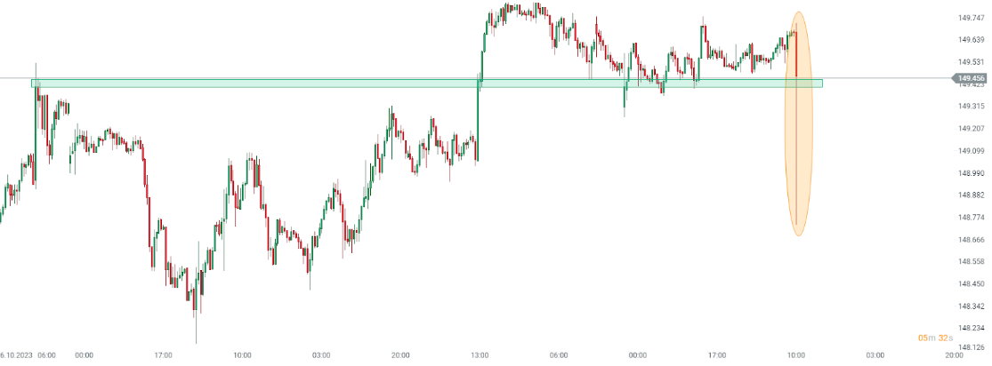Si observamos el gráfico del par USD/JPY en un intervalo de 30 minutos, podemos ver que el par cayó alrededor de un 0,6% y marcó un mínimo diario cerca de 148,75. Sin embargo, la mayor parte de la medida ya ha sido borrada.