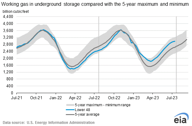 La Administración de Información de Energía (EIA) estima que el gas de trabajo almacenado es de 2.987 mil millones de pies cúbicos (Bcf). Esta cifra indica un aumento neto de 16 Bcf con respecto a la semana anterior. En comparación con el mismo período del año pasado, las existencias son más altas en 573 Bcf y por encima del promedio de cinco años en 345 Bcf. Por lo tanto, el gas de trabajo total de 2987 Bcf se encuentra dentro del rango histórico de cinco años..