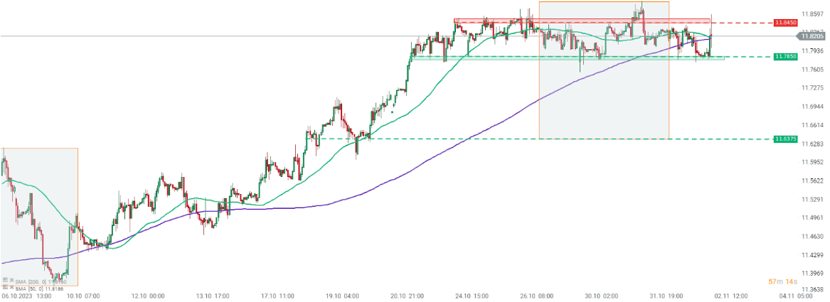 El banco cumplió esas expectativas y los tipos permanecieron invariables por primera vez desde principios de enero de 2023. La corona noruega se debilitó en un movimiento instintivo y el par EURNOK se impulsó por encima del límite superior del rango en el que estaban inmerso la gráfica. Sin embargo, esos movimientos se corrigieron rápidamente y el par cotiza plano en comparación con los niveles previos al anuncio. Echando un vistazo al EURNOK en el intervalo H1, podemos ver que una importante zona de oscilación técnica, marcada con promedios móviles de 50 y 200 sesiones, se está probando al momento de esta publicación.