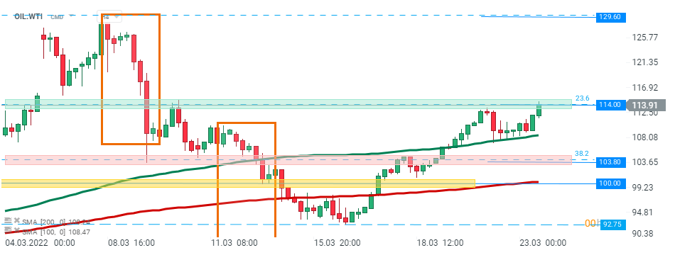 La publicación del informe de hoy no tuvo un impacto significativo en los precios del petróleo. El petróleo WTI (OIL.WTI) continúa operando alrededor del nivel de 114 USD. Fuente: xStation5
