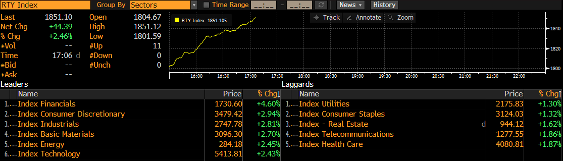 Russell 2000 sube un 2,5% hoy, impulsado por el sólido rendimiento de las acciones financieras. Fuente: Bloomberg