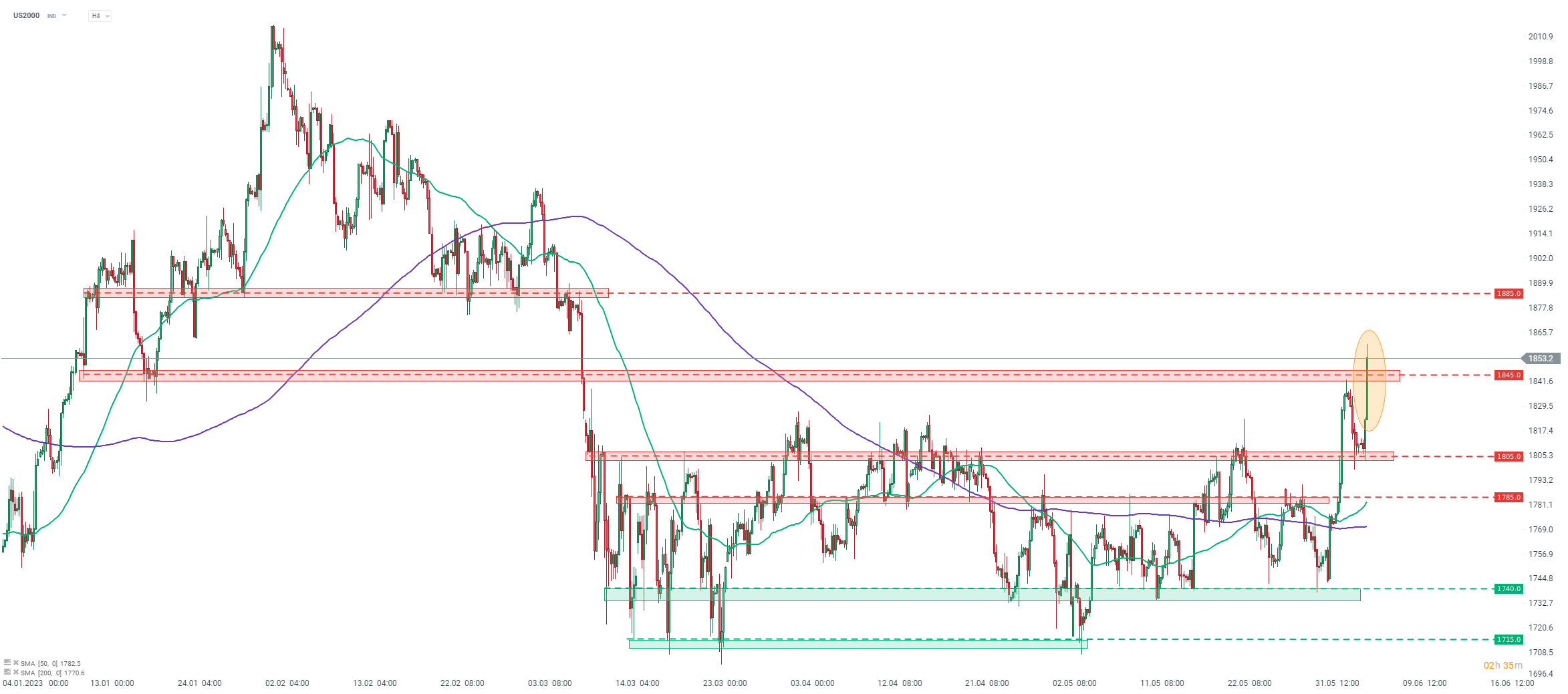 Los futuros de Russell 2000 (US2000) se recuperaron hoy y lograron subir por encima de la zona de resistencia de 1.845 pts durante la sesión. El índice cotiza a un máximo de 3 meses. La siguiente zona de resistencia a observar se puede encontrar en el área de 1.885 pts. Fuente: xStation5