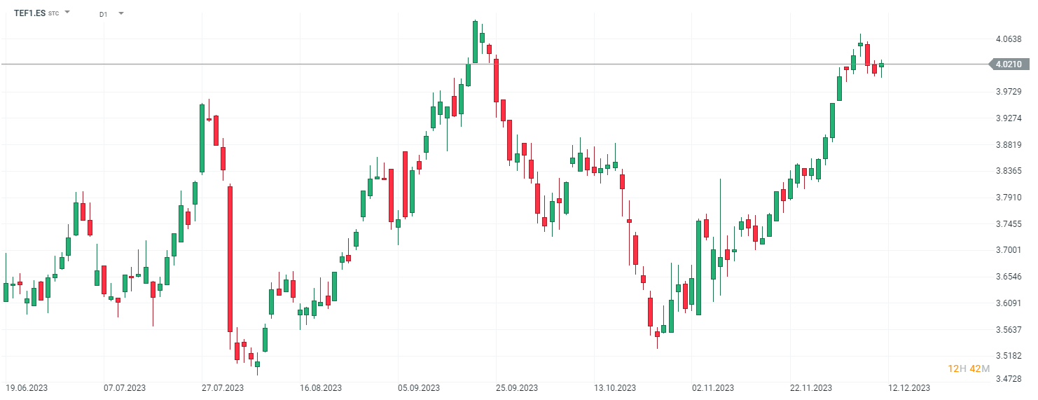 Hoy 11 de diciembre es el último día en el que los inversores pueden comprar acciones de Telefónica (TEF1.ES) para optar al dividendo que se reparte este jueves 14 de diciembre. Cualquier inversor que compre a partir de mañana, tendrá que esperar al 2024 para cobrar dividendos de la española.