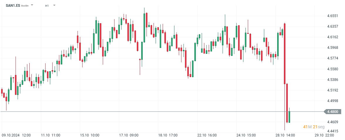 El importe del dividendo del Banco Santander alcanza los 10 céntimos por acción. En la sesión de hoy, las acciones de la entidad se dejan ya un 3,5%. No obstante, los títulos siguen un 16% por encima de los precios con los que el banco cerró el 2023.