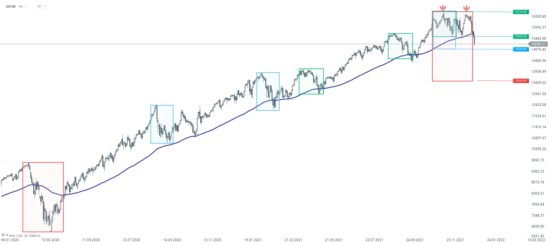 Mirando el intervalo D1, pareciera que aun no hay razón para entrar en pánico. Sin embargo, se dee notar que el índice cayó bajo la media movil de 100 días, que actuó como soporte clave en el pasado. Cada caída hasta la línea purpura, condujo a rápidos movimientos alcistas que culminaron en máximos históricos. Sin embargo, esta vez, el rebote en los precios sobre la EMA100 que ocurrió en diciembre no fue lo suficientemente fuerte para llevar al índice a nuevos máximos. Como resultado, parece haberse formado una figura de doble-top, loq que sumado a la ruptura del soporte de 15,590 (línea verde) podría generar más actividad en los vendedores. El siguiente soporte importante a considerar se ubica en 15,000, que equivaldría a la anterior corrección más severa (rectángulo azul). De romperse este nivel, podría esperarse una caída tal como la de 2020, provocada por la pandemia (rectángulo rojo).