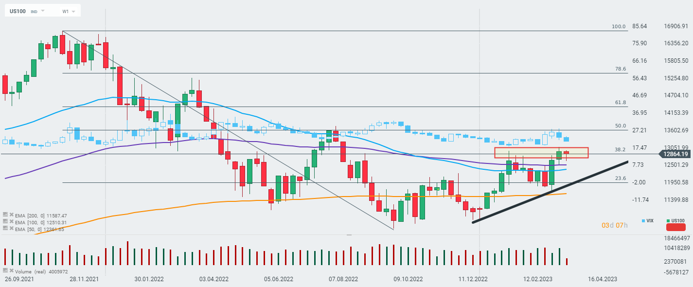 El índice US100 está tratando de mantener el impulso alcista iniciado hace 2 semanas, y el VIX con caídas fuertes puede respaldar el lado de los compradores incluso ahora. Sin embargo, vale la pena observar la sesión de mañana y del viernes, cuando conoceremos muchas lecturas macro interesantes de la economía estadounidense. Intervalo W1. Fuente: xStation 5