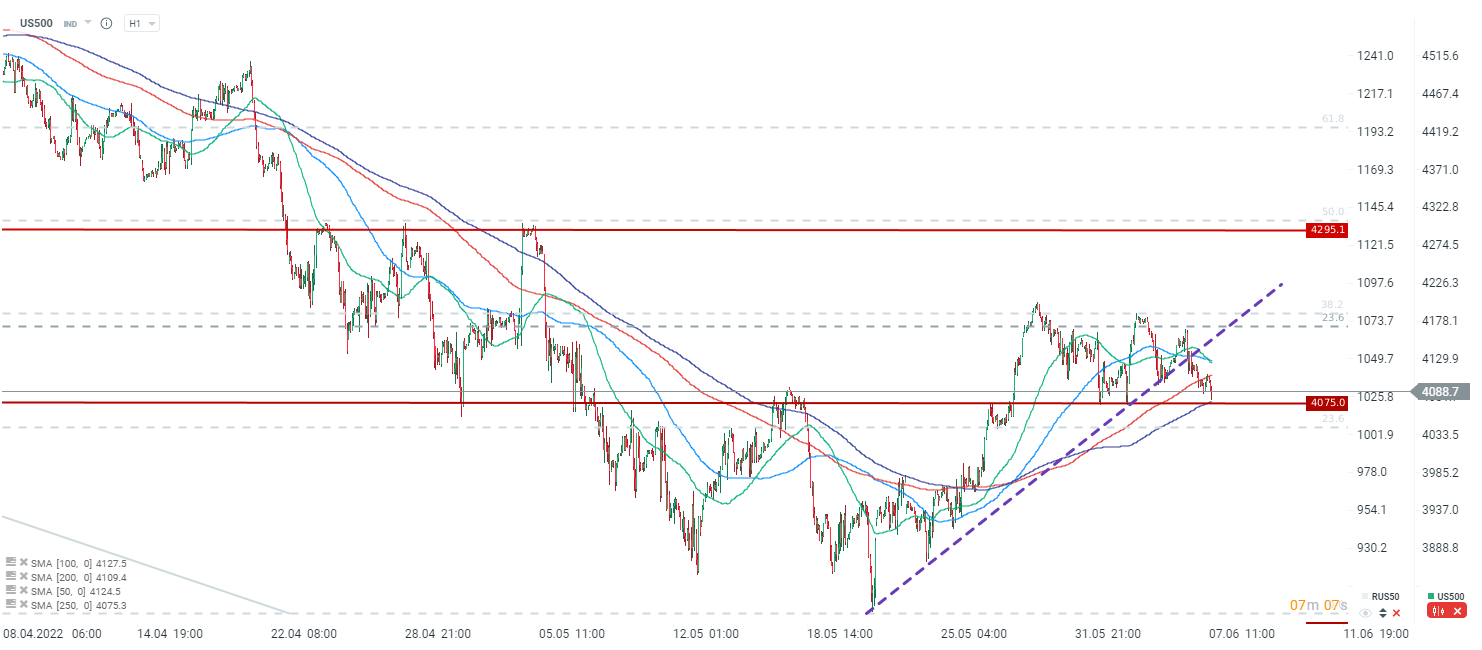 El S&P 500 ha retrocedido bruscamente, pero mantiene un soporte clave a corto plazo. Por otro lado, ayer se rompió la línea de tendencia alcista de corto plazo. Fuente: xStation5