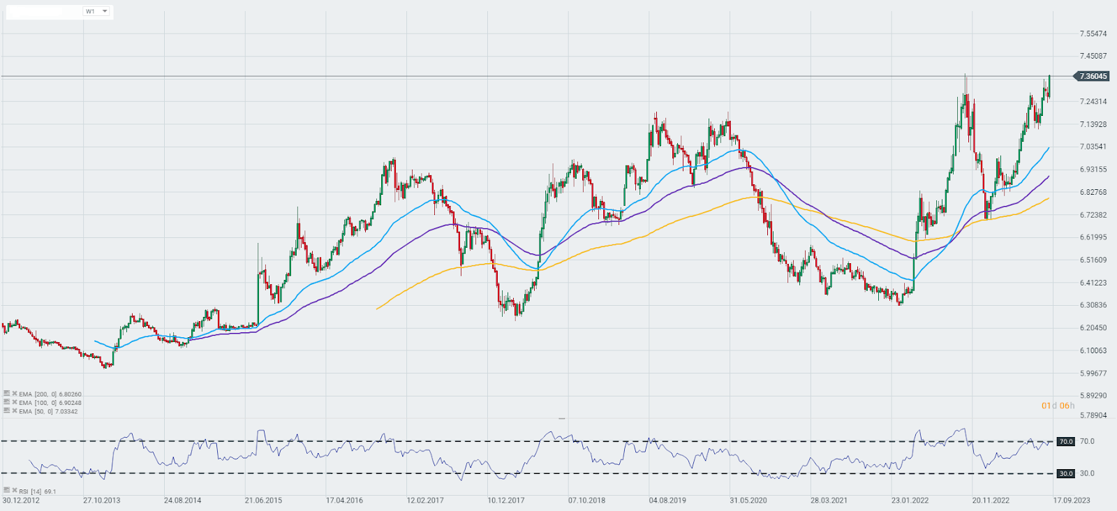 Los inversores y comerciantes en este ámbito prestan atención primaria al par EUR/USD, sin embargo, en este caso vale la pena observar el valor de la moneda de reserva mundial frente al yuan chino. En el mercado interno, el yuan terminó la sesión de hoy en su nivel más bajo desde 2007, luchando contra las presiones de salida de capital y una creciente brecha de rendimiento con las principales economías. En cuanto a la negociación de la moneda en el amplio mercado de divisas, sin embargo, el par USD/CNH rompió hoy hasta niveles de 7.35, que rozan los niveles más altos registrados desde octubre de 2022. La razón de tales grandes ventas de yuanes a diario fue la fijación más baja para el par de divisas en dos meses.
