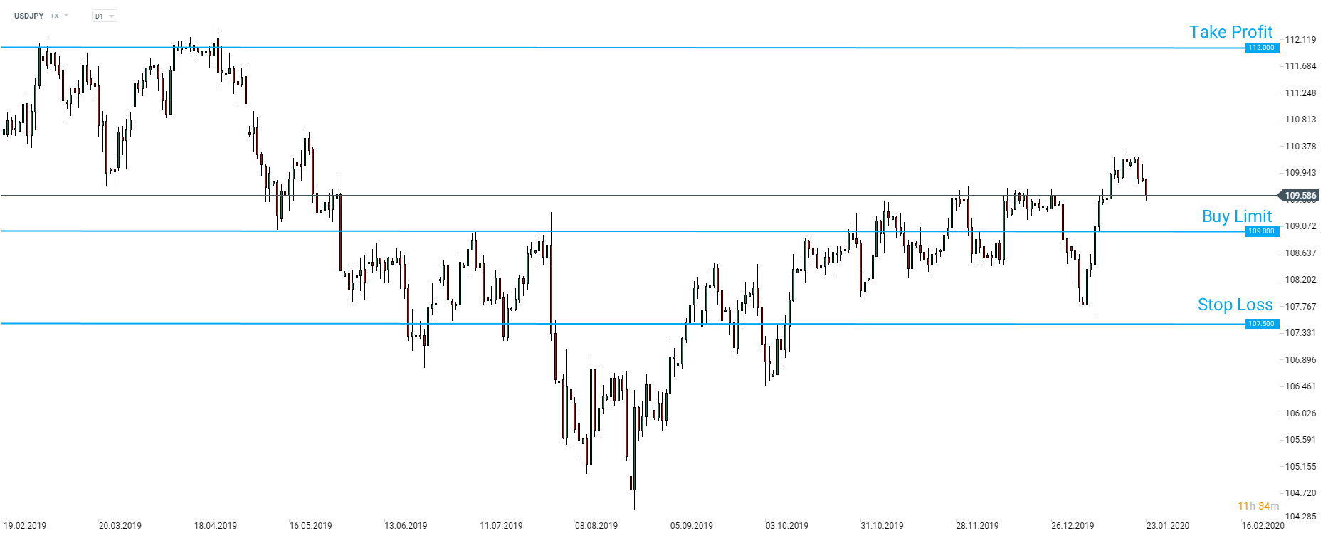 Deutsche Bank recomienda tomar una posición larga pendiente (Buy Limit) sobre USDJPY en 109.00. El objetivo se situa en 112 y el Stop-loss en 107.5. Fuente: xStation5