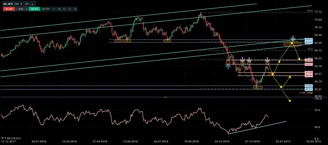 La semana pasada comentamos que “el petróleo había sufrido un desplome espectacular durante los últimos meses del año 2018, rompiendo la estructura alcista que había mantenido desde finales de 2015. A partir de ahí el entorno se había vuelto claramente bajista de nuevo. Sin embargo, la situación de extrema sobreventa unido a la importancia del soporte en 42.70/43.00 estaban permitiendo los primeros rebotes tácticos significativos. Y dijimos que todavía esperábamos que dichos rebotes se extendieran hacia la primera zona de resistencia entre 53.50 y 55.30, desde donde podríamos ver nuevamente surgir presiones vendedoras”. El viernes pasado el petróleo rozo la zona de techos y hoy estamos asistiendo a un comienzo de sesión bajista. El movimiento actual podría detenerse entre 48.40 y 49.90, y de ser este el caso estaríamos ante la posibilidad de que se forme un h-c-h invertido que se activaría con cierres por encima de 55.50. Si este fuese el caso, espero que durante las próximas semanas el crudo extienda sus ganancias hacia 62.00/64.00 donde aprovecharía para abrir estrategias de venta de nuevo. Por otro lado, en el caso de que la corrección actual no se detenga en 48.40 implicaría que hay muchas probabilidades de que el precio vuelva a re-testear los mínimos en 42.30/90 otra vez.