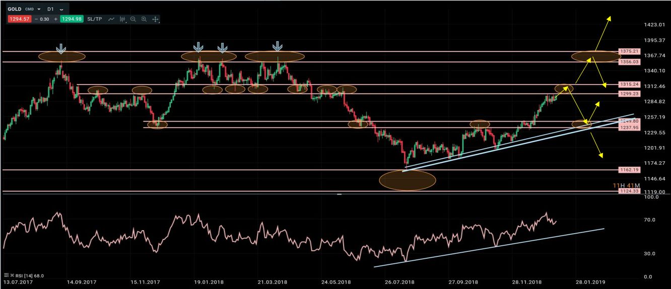 La semana pasada comentamos que “el oro había sido, junto al yen y al bono, uno de los activos en el que se habían refugiado los inversores ante la fuerte caída de las bolsas durante el mes de diciembre. La situación a medio plazo mostraba un gran rango lateral con una zona de resistencia muy bien definida en el entorno de 1360/1380, que no se superaba desde el año 2013, y por abajo un primer soporte fuerte entre 1125 y 1160. A corto plazo dijimos que el precio estaba llegando a la primera zona de resistencia entre 1300/1315, por lo que no sería raro ver algún retroceso técnico desde ahí”. Todavía no se aprecian síntomas de vuelta a la baja por lo que es probable que el oro continúe su avance hasta su primera resistencia. A partir de ahí habrá que estar muy atentos al desarrollo de posibles divergencias bajistas en el RSI, ya que podrían ser el catalizador de una corrección hacia 1250 donde se encuentra la línea de tendencia que une todos los mínimos crecientes desde mediados de 2018. Solo la ruptura de esta línea abriría extensiones hacia niveles mucho más bajos (1162). Por el contrario, una ruptura clara de 1315 implicaría que el escenario más probable es que la subida actual se extienda hasta 1355/75. Por encima de 1375 se activaría una señal muy positiva con objetivos en 1525/50.